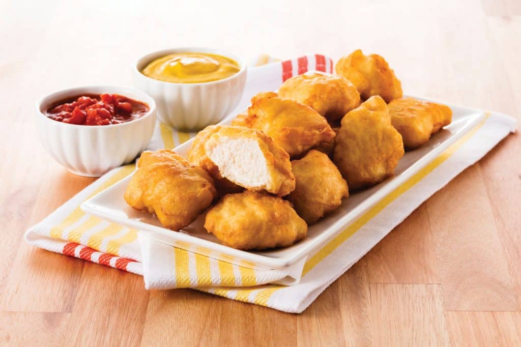 Frozen, fully cooked chicken nuggets in a tasty golden batter